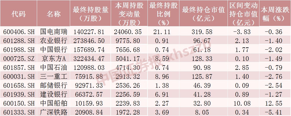 从市场表现情况来看,本周北向资金持股增加数前十的股票中除中国船舶上涨12.55%外,其他股票均下跌,广深铁路跌幅最大,下跌5.41%。