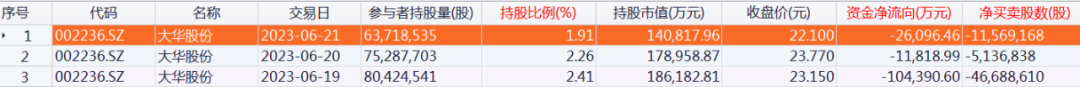 大华股份为本周北向资金减仓金额最高的个股,持股数减少6339.46万股,减仓金额达14.23亿元。从明细数据来看,本周北向资金连续3个交易日减仓大华股份,其中6月19日减仓超10亿元。