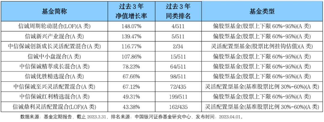 截至2023.03.31,中信保诚基金旗下近三年排名同类前1/2的9只基金为:中信保诚精萃成长混合(A类) 64/511、信诚优胜精选混合(A类) 98/511、信诚中小盘混合(A类) 15/511、信诚周期轮动混合(LOF)(A类) 4/511、信诚新兴产业混合(A类) 4/511 、中信保诚红利精选混合(A类) 199/511、中信保诚创新成长灵活配置混合(A类) 2/34、信诚鼎利灵活配置混合(LOF)(A类) 162/435、中信保诚至兴灵活配置混合(A类) 72/435。其中前6只基金类型为:偏股型基金(股票上下限60%-95%)(A类)。中信保诚创新成长灵活配置混合(A类)类型为:灵活配置型基金(股票比例挂钩估值)(A类),信诚鼎利灵活配置混合(LOF)(A类)、中信保诚至兴灵活配置混合(A类)类型为:灵活配置型基金(基准股票比例30%-60%)(A类)。(评价来源:中国银河证券基金研究中心,评价发布时间:2023.04.01 )