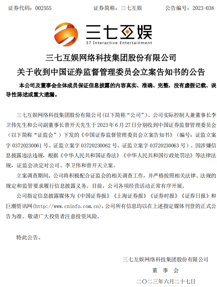 三七互娱公告,因涉嫌信息披露违法违规,证监会决定对公司、公司实际控制人兼董事长李卫伟和公司副董事长曾开天立案。