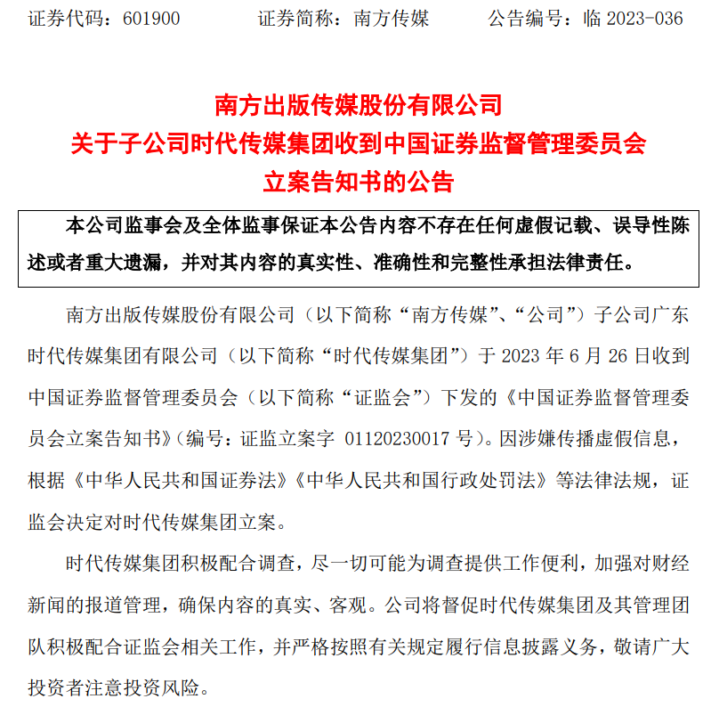 公司称,时代传媒集团积极配合调查,尽一切可能为调查提供工作便利,加强对财经新闻的报道管理,确保内容的真实、客观。公司将督促时代传媒集团及其管理团队积极配合证监会相关工作,并严格按照有关规定履行信息披露义务。