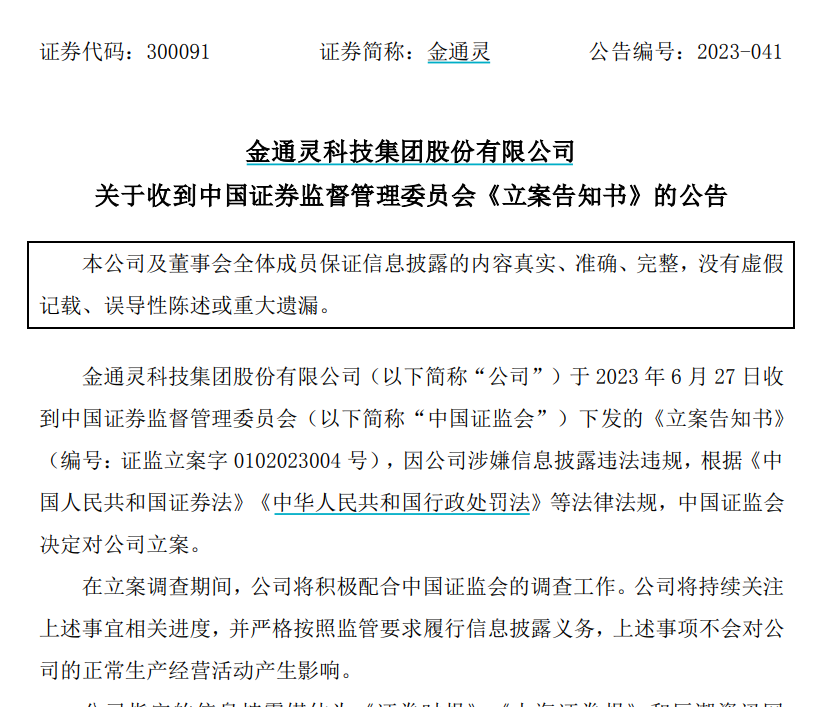 金通灵:因涉嫌信息披露违法违规,证监会决定对公司立案