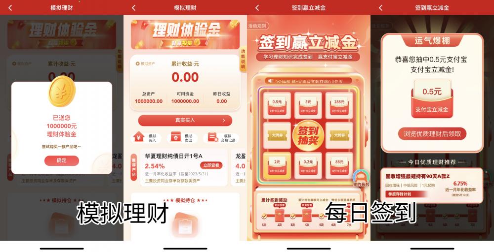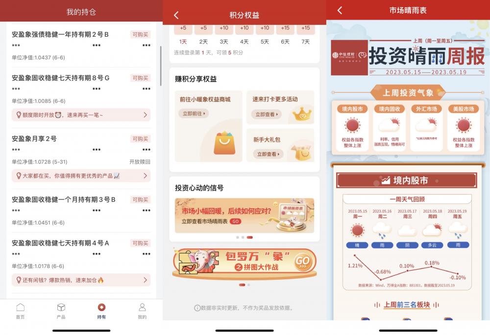 在首页的功能设置方面,信银理财增加理财日历及净值速递帮助用户筛选产品,其中理财日历可以看到今日开放、高频开放、定期开放、稳健专区四类产品;净值速递可以搜索和查看产品净值、信息披露等信息,为四个平台中唯一一家提供此类信息查询的平台。华夏理财增加每日签到、模拟理财等,其中模拟理财可以进行模拟持仓,每日签到结合投教和营销活动吸引用户关注。