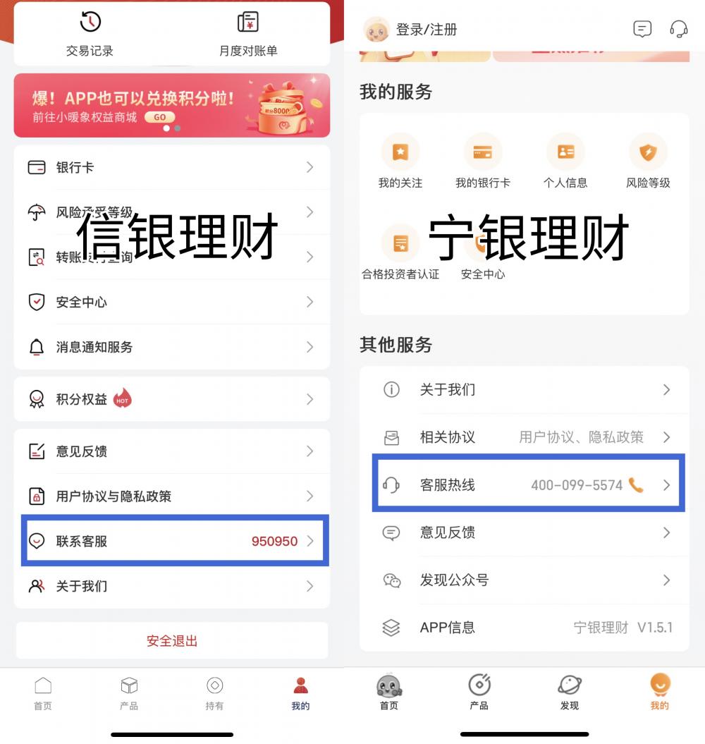 在当前的设置下,客服电话就成了理财APP用户进行客服咨询的主要渠道,测评中4个APP均将客服电话设置在比较明显的位置,如信银理财、宁银理财将客服电话设置在“我的”板块中,点击可以直接拨打,体验明显优于生态建设繁复的手机银行。