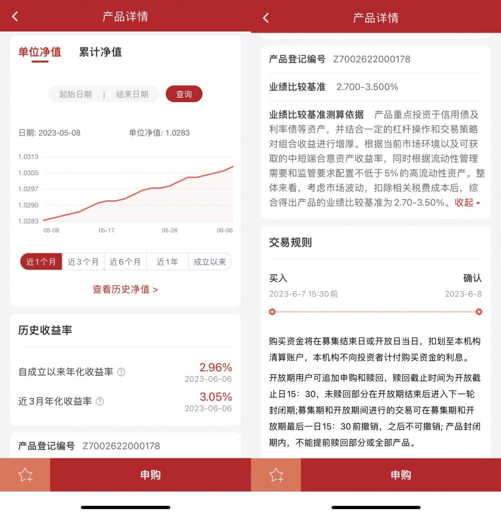 单个理财产品的产品介绍页面是用户了解产品、获取相关信息的主要渠道。理财APP在此页面的设计方面均较为类似,产品类型、风险等级、交易规则、产品投向及相关协议公告等均可在此页面查看。