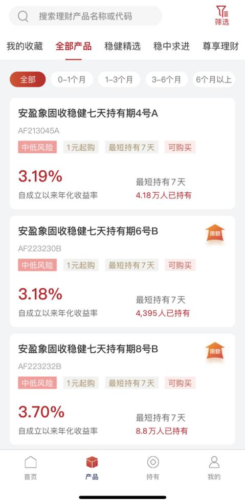 1、APP内理财产品可购买产品数量从几款到几十款不等
