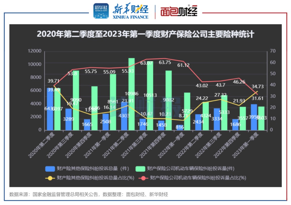 数据显示,2023年第一季度,在涉及财产保险公司的投诉中,机动车辆保险纠纷投诉达3603件,较2022年四季度相比微增46件,环比上升1.3%,在财产保险公司季度投诉总量中的占比达31.6%,较2022年一季度占比明显下降29.5个百分点。