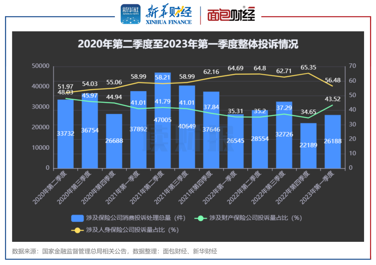 国家金融监督管理总局公布的保险公司消费投诉数据显示,2023年第一季度,监管部门处理消费投诉总量26188件,同比下降1.3%,环比上升18%。