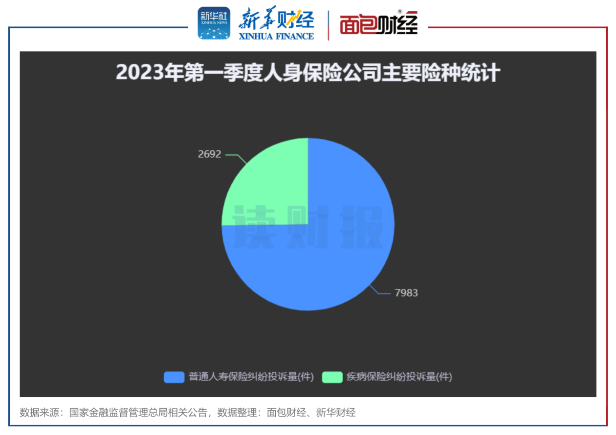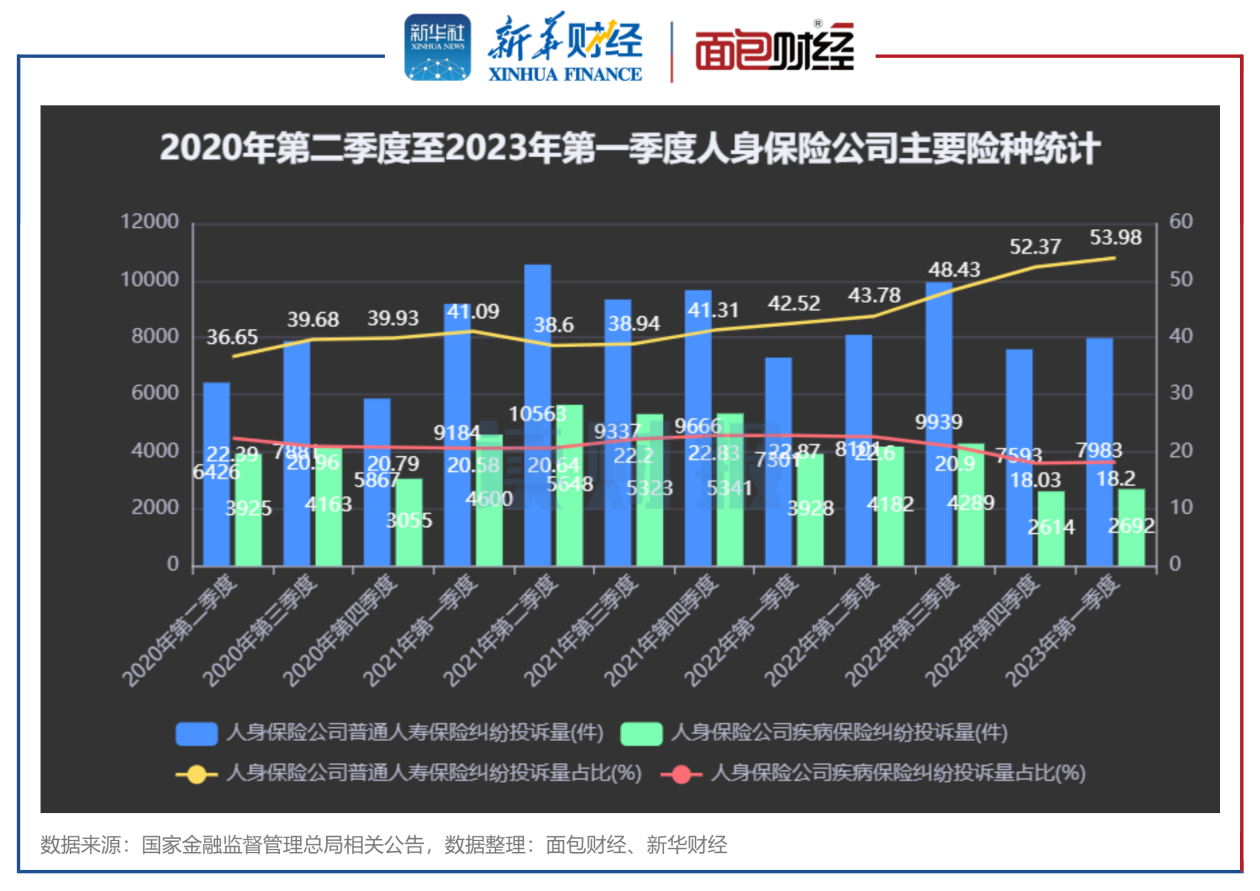 数据显示,2023年第一季度,在涉及人身保险公司投诉中,普通人寿保险纠纷投诉为7983件,较2022年第四季度上升390件,环比上升5.1%;占人身保险公司季度投诉总量的54%,较2022年第四季度占比增长11.5个百分点。