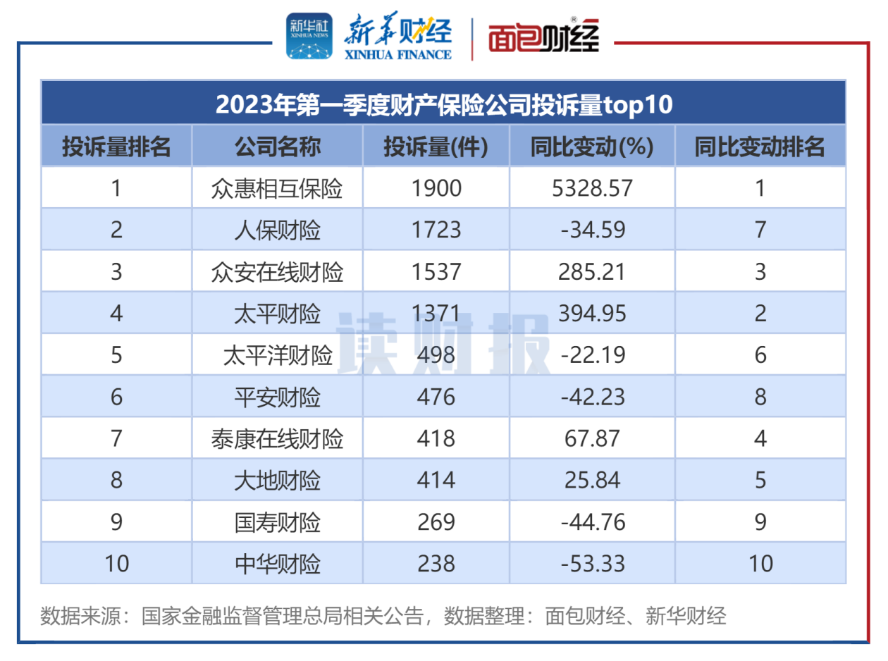 通报数据显示,2023年第一季度,财产保险公司中,众惠相互保险、人保财险和众安在线财险、太平财险位列前四,投诉量均超1千件,分别为1900件、1723件、1537件和1371件。增速方面,众慧、太平和众安增速较快,分别达5328.57%、394.95%和285.21%。