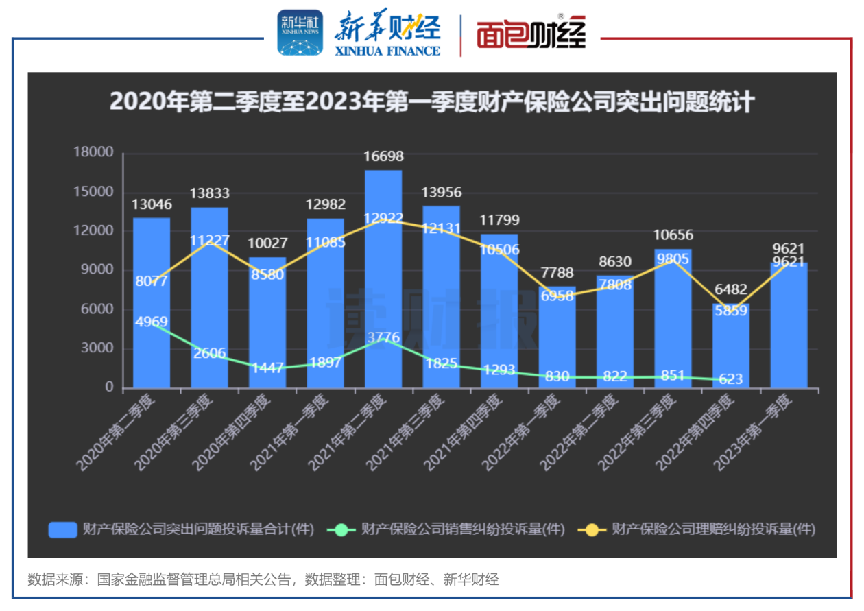 信披数据显示,2023年第一季度,财产保险公司突出问题投诉仅披露了较突出的理赔纠纷数据,投诉量合计9621件,较上年同期增加2663件,同比上升38.3%;较2022年第四季度相比增加3762件,环比增长64.2%。
