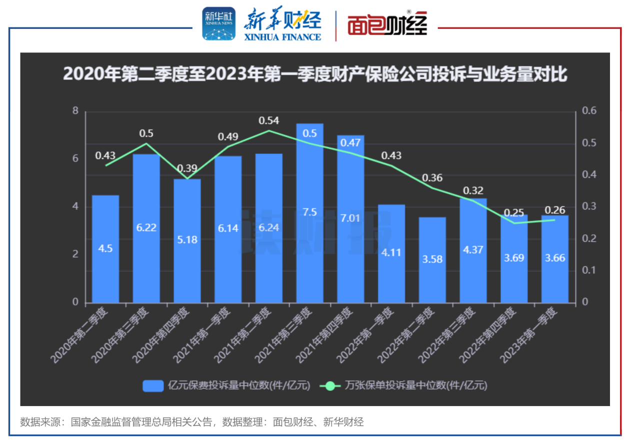 其中,2023年一季度财产保险公司亿元保费投诉量中位数为3.66件/亿元,较2022年四季度减少0.03件。
