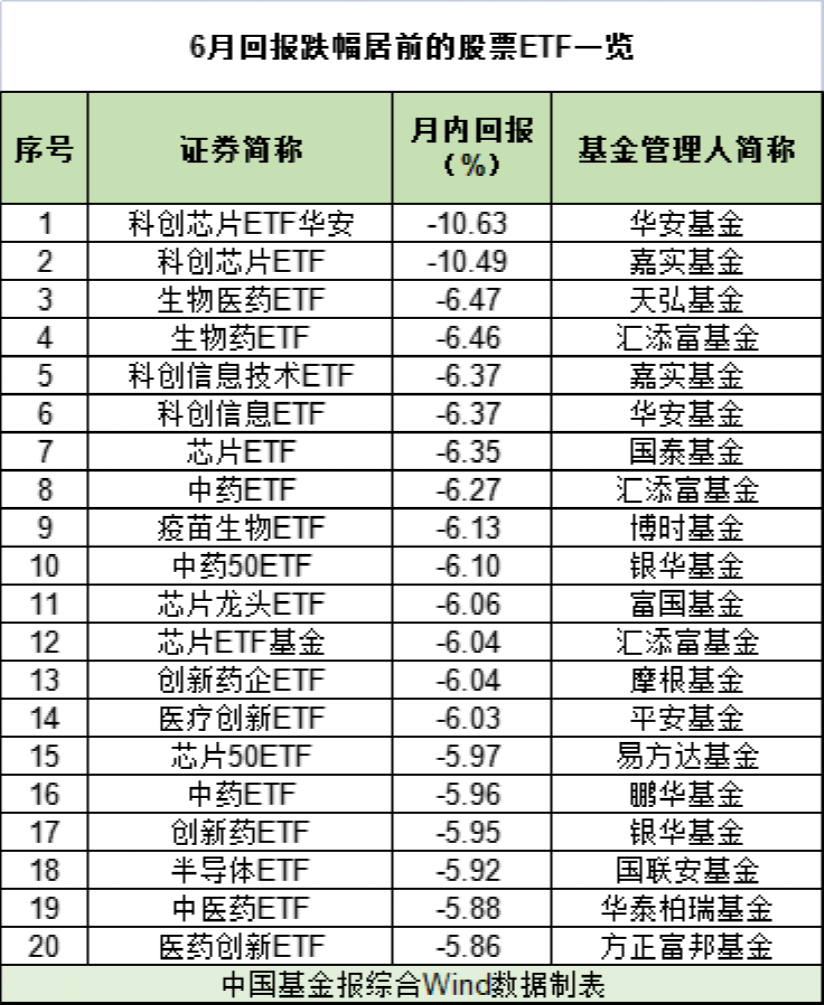 另一方面,半导体主题ETF、医药主题ETF产品月内跌幅居前,几乎包揽了月度回报跌幅前20。