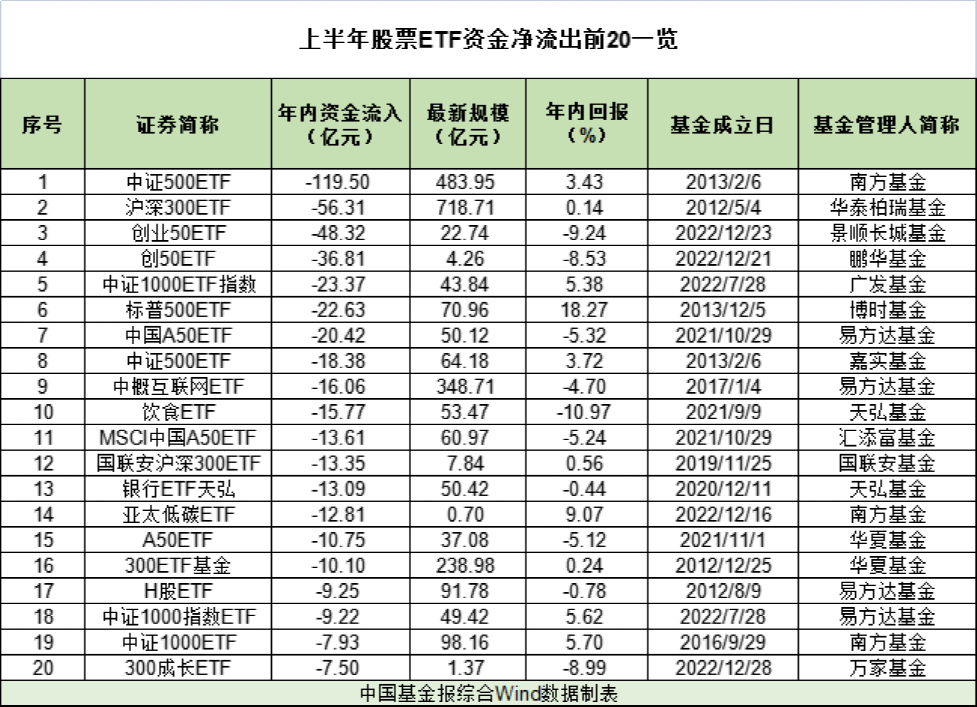 截至6月30日,股票ETF市场共有30只产品规模超百亿,其中半数产品规模超200亿。目前,华泰柏瑞旗下沪深300ETF仍位居首位,不过年内资金净流出了56亿元,最新规模为718.71亿元。华夏基金旗下2只产品科创50ETF、上证50ETF排在二三位,年内资金分别净流入163.69亿元、净流出6.74亿元,最新规模分别为671.95亿元、576.23亿元。