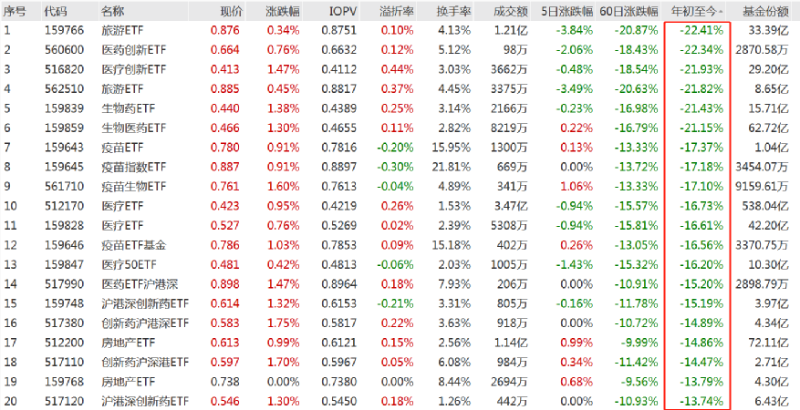 另一方面,旅游ETF上半年跌幅居前,达23.41%;而月内回报欠佳的医药主题ETF,上半年收益率跌幅也居前,前20时中有16只产品为医药主题ETF;此外,还有两只地产主题ETF排在跌幅前20位。