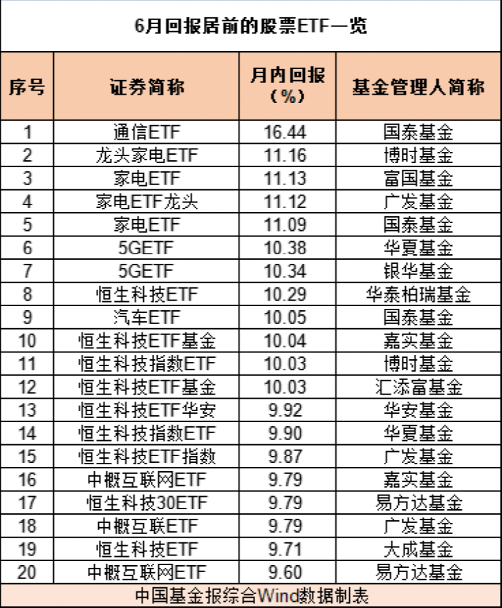 月内回报上,6月通信ETF领涨,涨幅达16.44%;4只家电主题ETF跻身前五,月度回报均超11%,并有多只港股ETF涨幅明显。