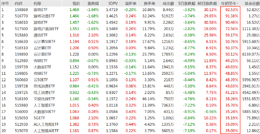拉长时间看年内回报表现,上半年游戏主题ETF领涨,并有3只回报超90%;6月领涨的通信ETF上半年回报也居前,以近60%的收益率排在第五位。还有多只人工智能主题ETF、云计算主题ETF、在线消费主题ETF跻身前20。