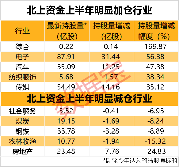 剔除今年新进的陆股通标的后,上半年综合、电子、汽车、纺织服饰、传媒、机械设备6个行业持股量增长幅度最高,均超过30%。传统板块明显遭到北上资金减持,房地产、农林牧渔、钢铁、煤炭、社会服务持股量降幅最大,其中房地产持股量降幅在20%以上。
