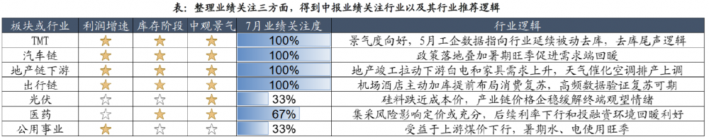 东吴证券:中报窗口,三条线关注业绩改善:出现利润增速拐点的行业、库存阶段可能发生切换行业、中观景气指标回暖行业。分析得出TMT、汽车链、地产链下游、光伏7月业绩关注度最高,医药、光伏、公用事业同样会受到市场关注,但关注度依次降低。