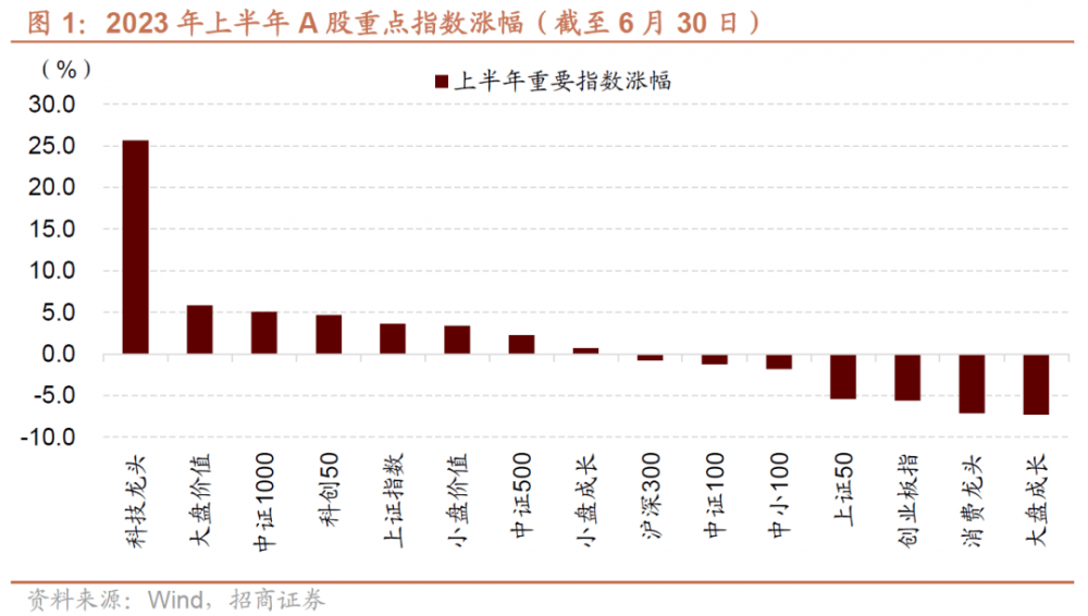 上半年A股涨跌分化,主线为TMT和中特估板块,但是行业轮动较快,其中科技龙头一枝独秀,上涨25.69%,主要指数中大盘成长、消费龙头跌幅较多,分别下跌7.31%,7.14%。