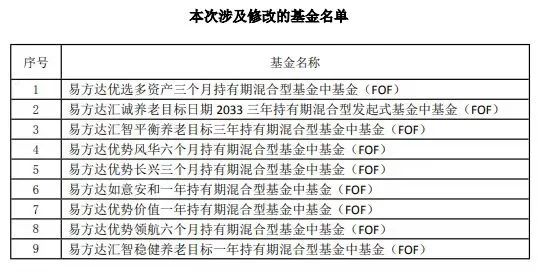 每家公司把REITs纳入投资范围的FOF产品数量各不相同,易方达基金最多,旗下涉及此次修订的基金共有9只,包括易方达优选多资产三个月持有期混合型基金中基金(FOF)、易方达汇智稳健养老目标一年持有期混合型基金中基金(FOF)等,既有权益类FOF,也有养老FOF,9只产品也更新了基金合同和托管协议。