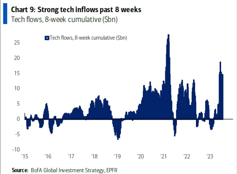 不过美国银行每周的资金流动报告显示,部分活跃资金仍在纷纷涌入科技股。该行策略师Michael Hartnett周四在一份报告中援引EPFR Global数据称,截至7月19日当周,科技基金吸引了18亿美元资金,为连续第四周吸引资金,并在过去八周“资金强劲流入”。