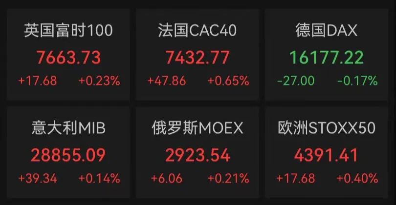 欧洲市场方面,欧股收盘多数上涨,英国富时100指数涨0.23%,周涨幅3.08%;法国CAC40指数涨0.65%,周涨幅0.79%;德国DAX指数跌0.17%,周涨幅0.45%。