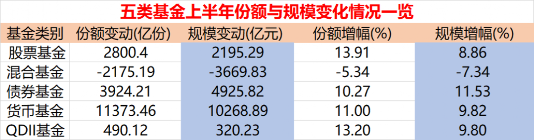 同期,作为现金管理工具的货币基金吸引力也很显著,半年里份额增加11373.46亿份,规模增长10268.89亿元,增幅9.82%。