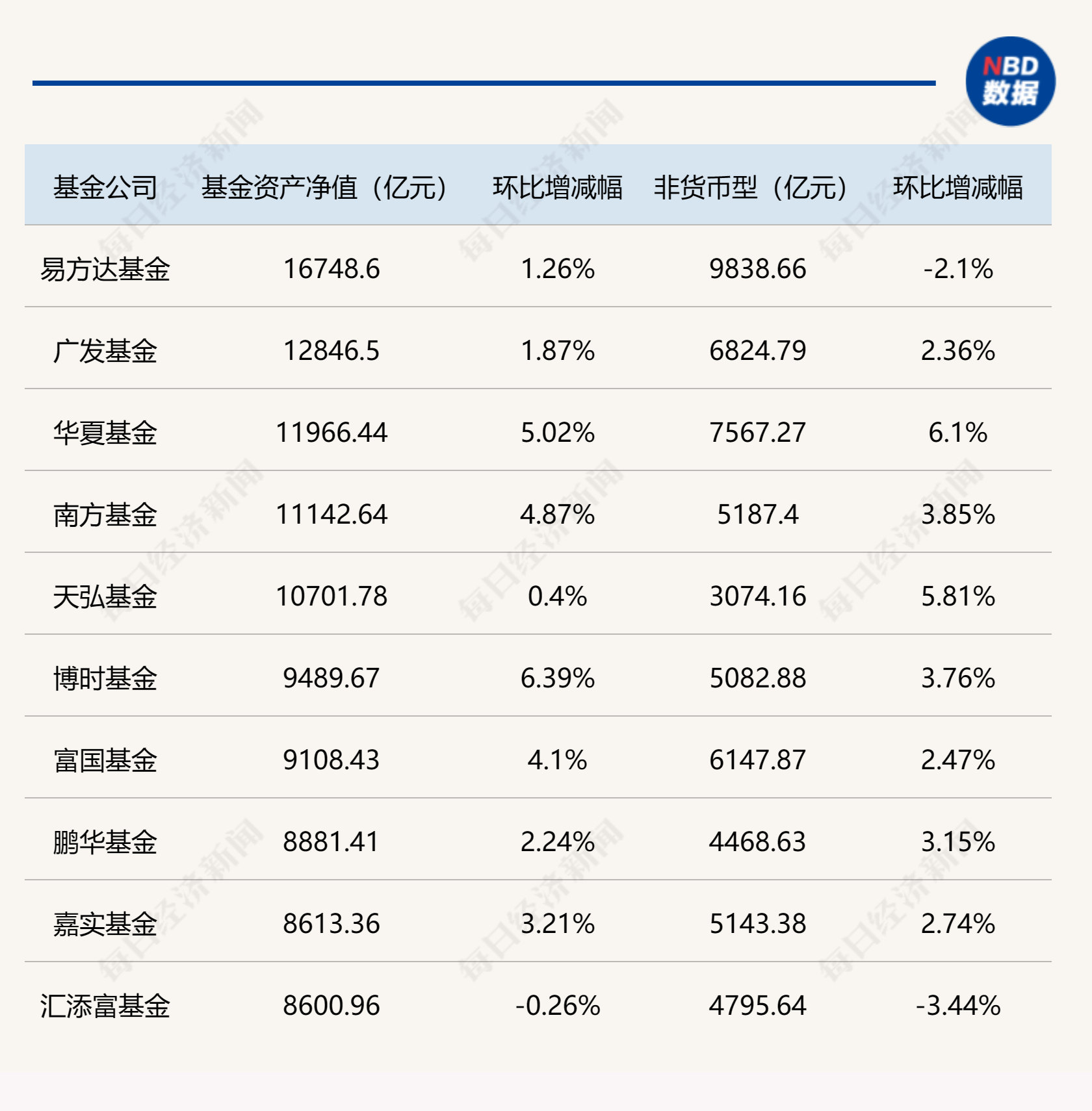 而从非货基的管理规模上来看,排在第一位的依然是易方达基金,截至二季度末管理非货基资产净值9838.66亿元;华夏基金以7567.27亿元排在第二位,环比增加了6.10%,在头部基金公司中涨幅最大;排在第三位的是广发基金,最新管理规模6824.79亿元,环比也上涨了2.36%。