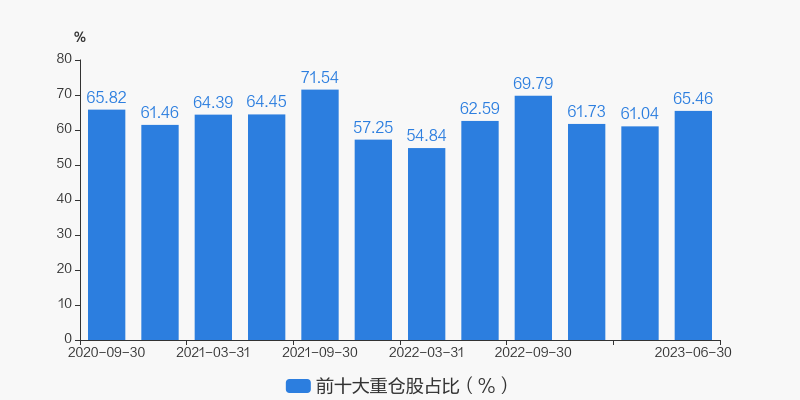 从十大重仓股情况来看,最新一期前十大重仓股占比为65.46%。