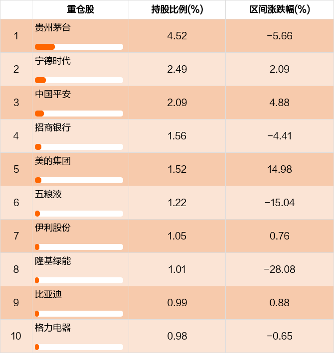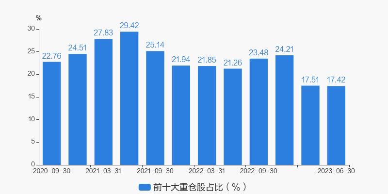 从十大重仓股情况来看,最新一期前十大重仓股占比为17.43%。