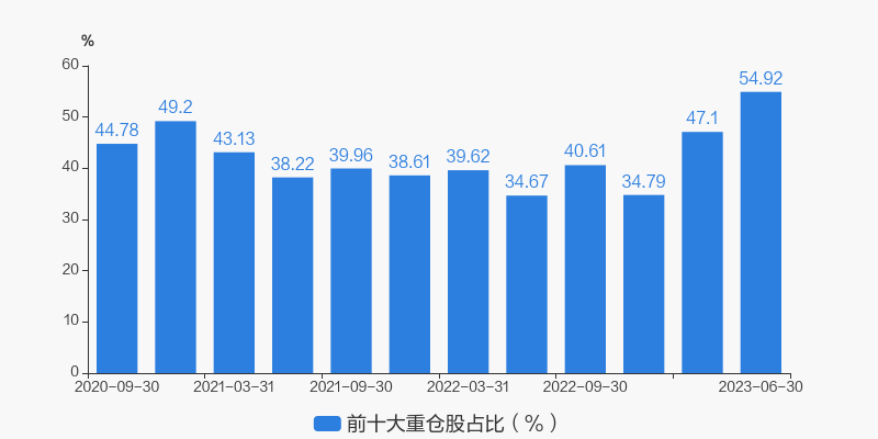从十大重仓股情况来看,最新一期前十大重仓股占比为54.93%。
