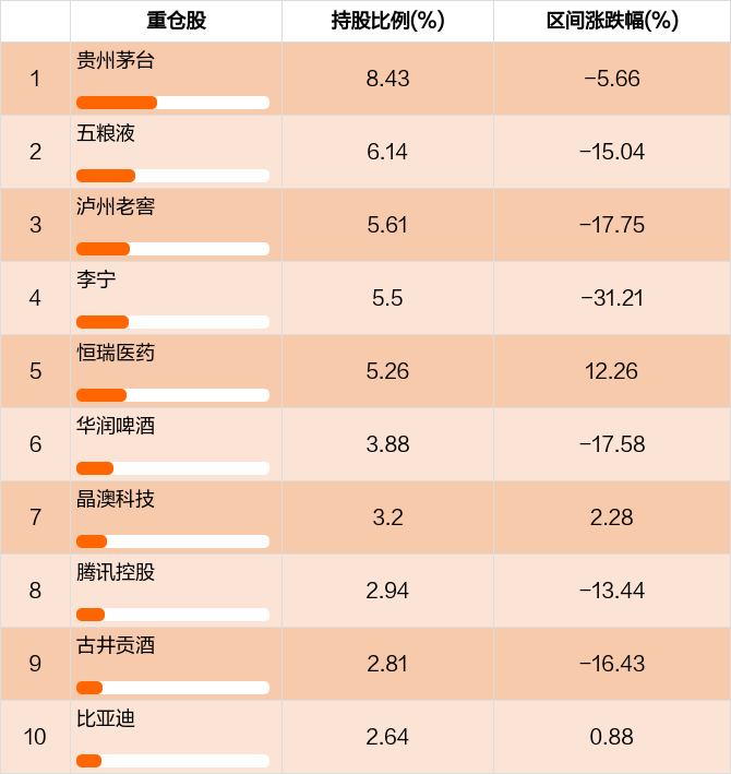 从十大重仓股情况来看,最新一期前十大重仓股占比为46.41%。
