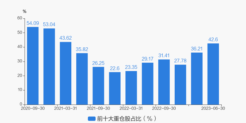 从十大重仓股情况来看,最新一期前十大重仓股占比为42.60%。