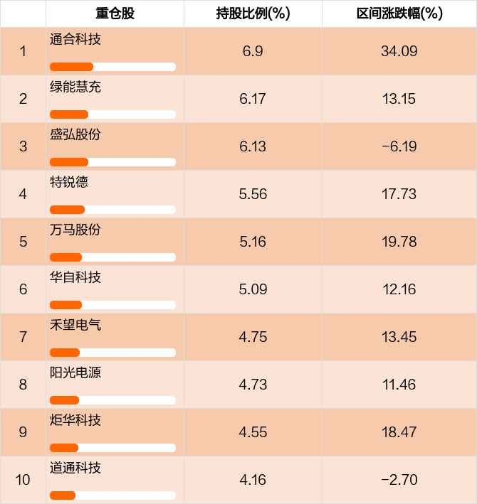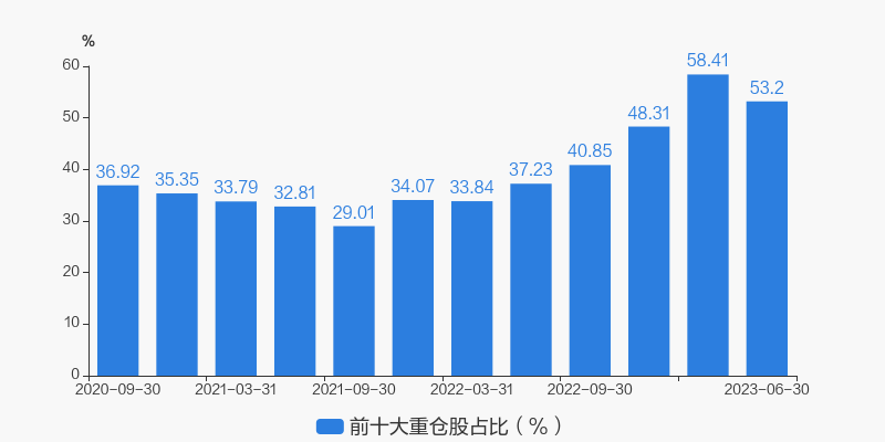 从十大重仓股情况来看,最新一期前十大重仓股占比为53.20%。