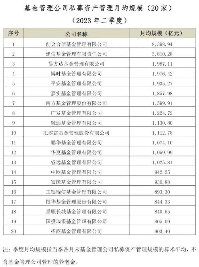 其中,创金合信基金仍位居首位,今年二季度月均规模为8398.94亿元;建信基金月均规模为3810.28亿元,位居其次,易方达赶超平安位列第三,博时、平安、嘉实、南方分居四-七名,月均规模都超过了1500亿,分别为1987.11亿元、1976.42亿元、1935.27亿元、1857.98亿元、1599.91亿元。