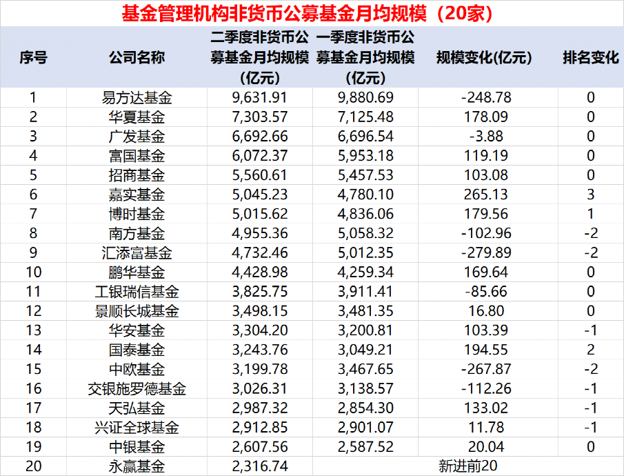 此外,永赢基金以2316.74亿元,新晋基金管理机构非货币公募基金月均规模排名前20强,上季度末刚刚新晋的华泰柏瑞基金再度淡出前20强之列。
