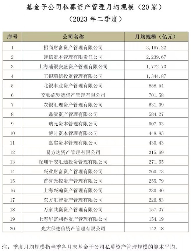 除了公募管理人前20强外,中国基金业协会还同时公布了基金专户、基金子公司、基金养老金业务月均规模数据。