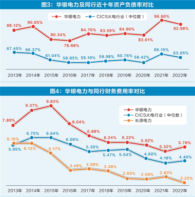 火电本来就具有重资产属性,长期亏损加上近年来加码清洁能源投入了相当多的资金,导致华银电力资产负债率居高不下。只不过,华银电力的债务压力相比上市同行更高了一些。截至2022年末,华银电力的资产负债率攀升至93%,而火电行业资产负债率中位数为63%,华银电力高出近30个百分点(图3)。