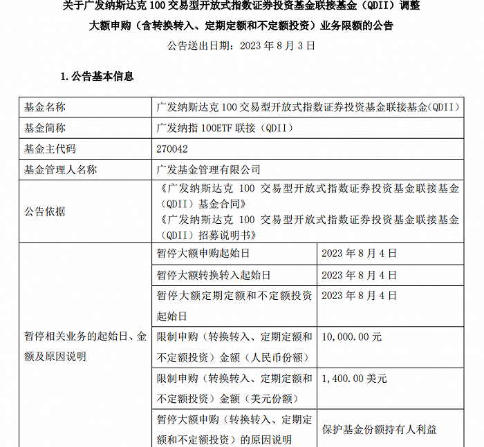 公告显示,自2023年8月4日起,广发纳指100ETF联接人民币份额单日单账户申购、定投及转换转入的限额调整为1万元,超过1万元的部分将确认失败;美元份额单日单账户申购、定投的限额调整为1400美元,超过1400美元的部分将确认失败。