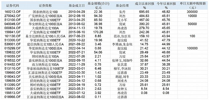 其中,成立最早的是国泰纳斯达克100指数基金,截至二季度末规模为22.36亿元。该基金成立以来回报率为695.65%,今年以来回报率为46.82%,目前单日申购额度为30万元。