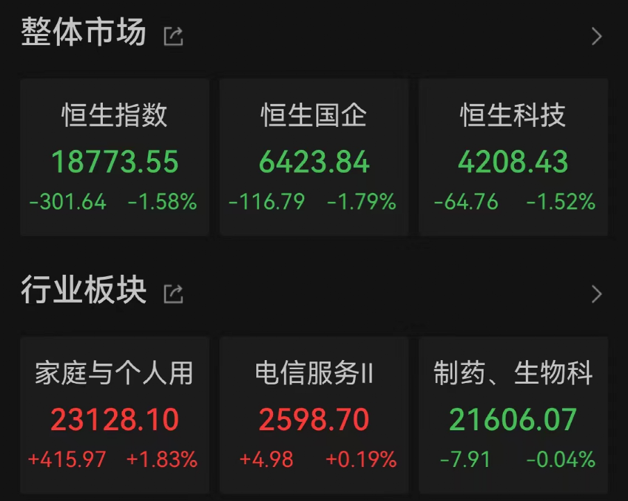 8月14日港股三大指数齐跌。据数据,恒生指数收于18773.55点,跌1.58%。恒生国企指数收于6423.84点,跌1.79%,恒生科技指数收于4208.43点,跌1.52%。大市成交1041.47亿港元。