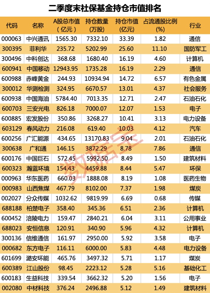 (原标题:社保基金最新持仓动向曝光,通信巨头持仓市值最高,六成重仓股半年报业绩报喜)
