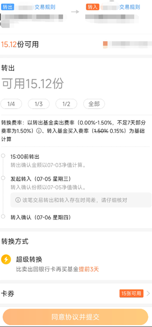 使用超级转换的时候,转入基金的费率高怎么办?最新版本支持超级转换使用费率折扣券,为您提供更大力度的优惠。