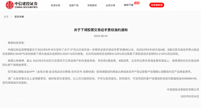 8月24日,中信建投证券发布关于下调股票交易经手费标准的通知:
