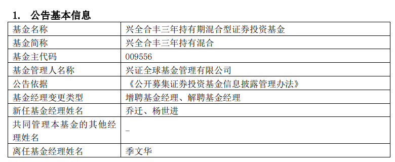 除了兴全趋势投资混合的基金经理进行调整之外,另外一只基金——兴全合丰三年持有混合的基金经理也进行了调整。
