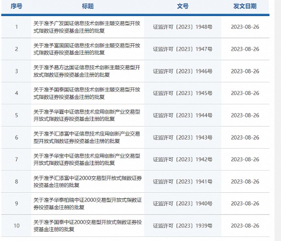 8月26日,证监会官网显示,华夏、易方达、广发、汇添富等10家基金公司申报的首批“中证2000ETF”、华宝、国泰、富国基金等7家基金公司上报的“信创主题ETF”,均已于当天获批。