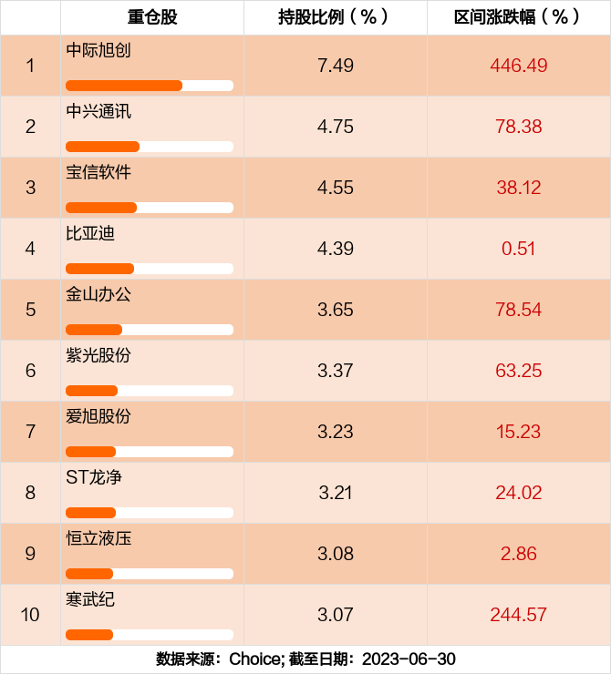 永赢高端制造混合A前十大重仓股分别是中际旭创,中兴通讯,宝信软件,比亚迪,金山办公,紫光股份,爱旭股份,ST龙净,恒立液压,寒武纪,前十大重仓股合计持股占总持仓比例40.79%。