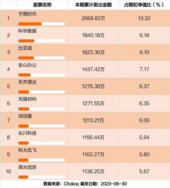 本期基金累计卖出金额最高的前十大个股分别是宁德时代,科华数据,比亚迪,金山办公,天齐锂业,天赐材料,深信服,长川科技,科大讯飞,海光信息。