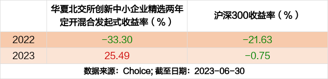2023年度,截止至6月30日,华夏北交所创新中小企业精选两年定开混合发起式基金收益25.49%,同期沪深300收益-0.75%,同类排名40/3541。